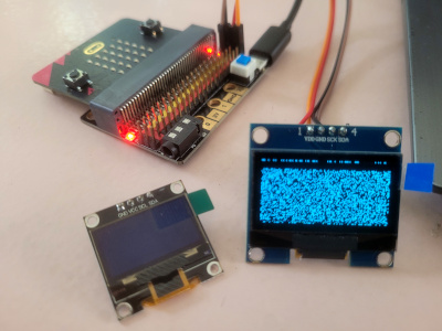 There are multiple OLED displays on sale online and so far, the 4 pin SSD 1306 0.96 inch 128×64 OLED display works with the current driver on micro:bit. The bigger 1.3 inch version 2.0 12864-81 OLED display has issues with the current driver on micro:bit and displays random noise upon initialization as shown below on the right.