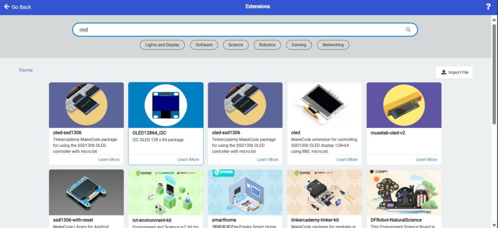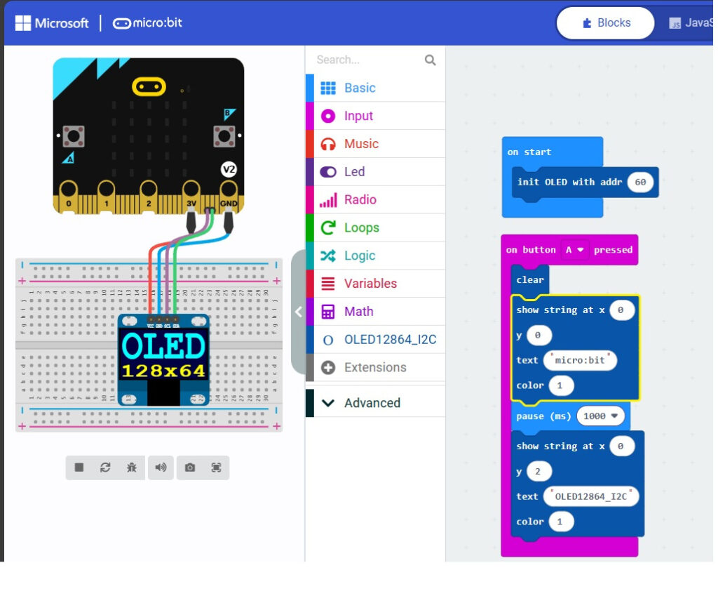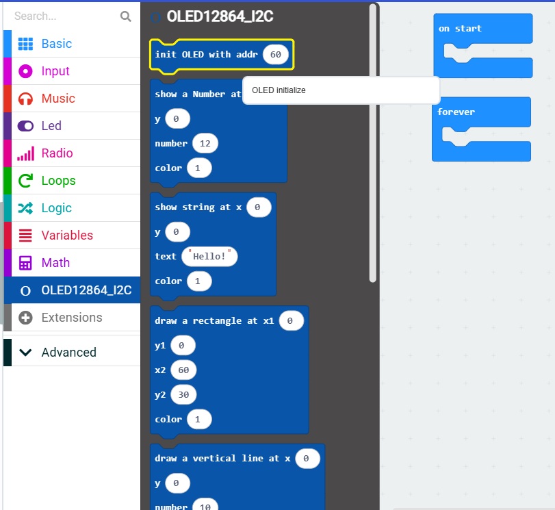 In order to use the OLED display using micro:bit, we need to load the OLED12864xI2C extension from makecode: